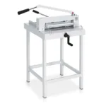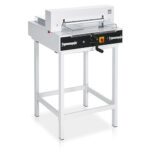 De origem alemã. Equipada com Sistema de Segurança de Corte “SCS”: Protector frontal electricamente fixado, transparente, que se desloca facilmente. Cobertura de segurança transparente na mesa traseira. Retorno automático da faca para qualquer posição. Botão para paragem automática da faca. Interruptor principal e fecho de segurança com chave. Mudança da faca com segurança, na parte frontal, sem retirar as tampas da máquina. Dispositivo para a mudança da faca com a extremidade de corte coberta. Ajuste da profundidade da faca a partir do exterior da guilhotina. A régua de corte pode ser virada ou substituída facilmente do exterior da guilhotina. Funcionamento electromecânico da faca. Calcador e corte automáticos. Manivela para avanço e recuo do encosto do papel. Leitura digital das medidas para o posicionamento do encosto traseiro (mm ou polegadas). Guia lateral preciso. Linha de corte iluminada. Faca de aço de alta qualidade.