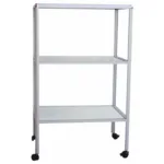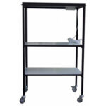 3 pratos de trabalho. Tomada de corrente tripla com terra. Cabo de alimentação com 5 metros. Pés rodados, 2 rodas com travão. Rodas em borracha.