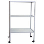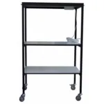 3 pratos de trabalho. Tomada de corrente tripla com terra. Cabo de alimentação com 5 metros. Pratos inferiores reguláveis em altura. Pés rodados, 2 rodas com travão.