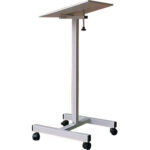 Prato regulável com inclinação. Pés rodados, 2 rodas com travão.